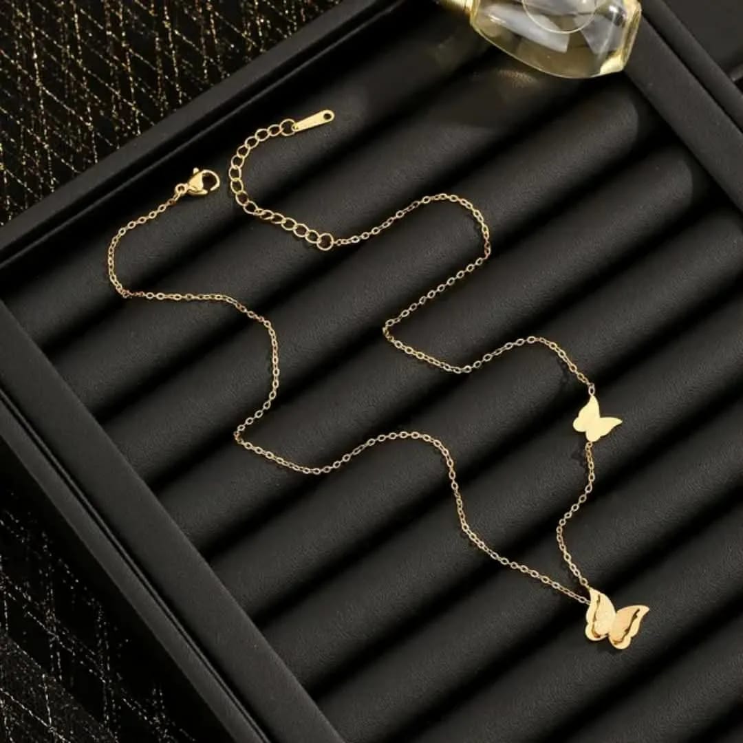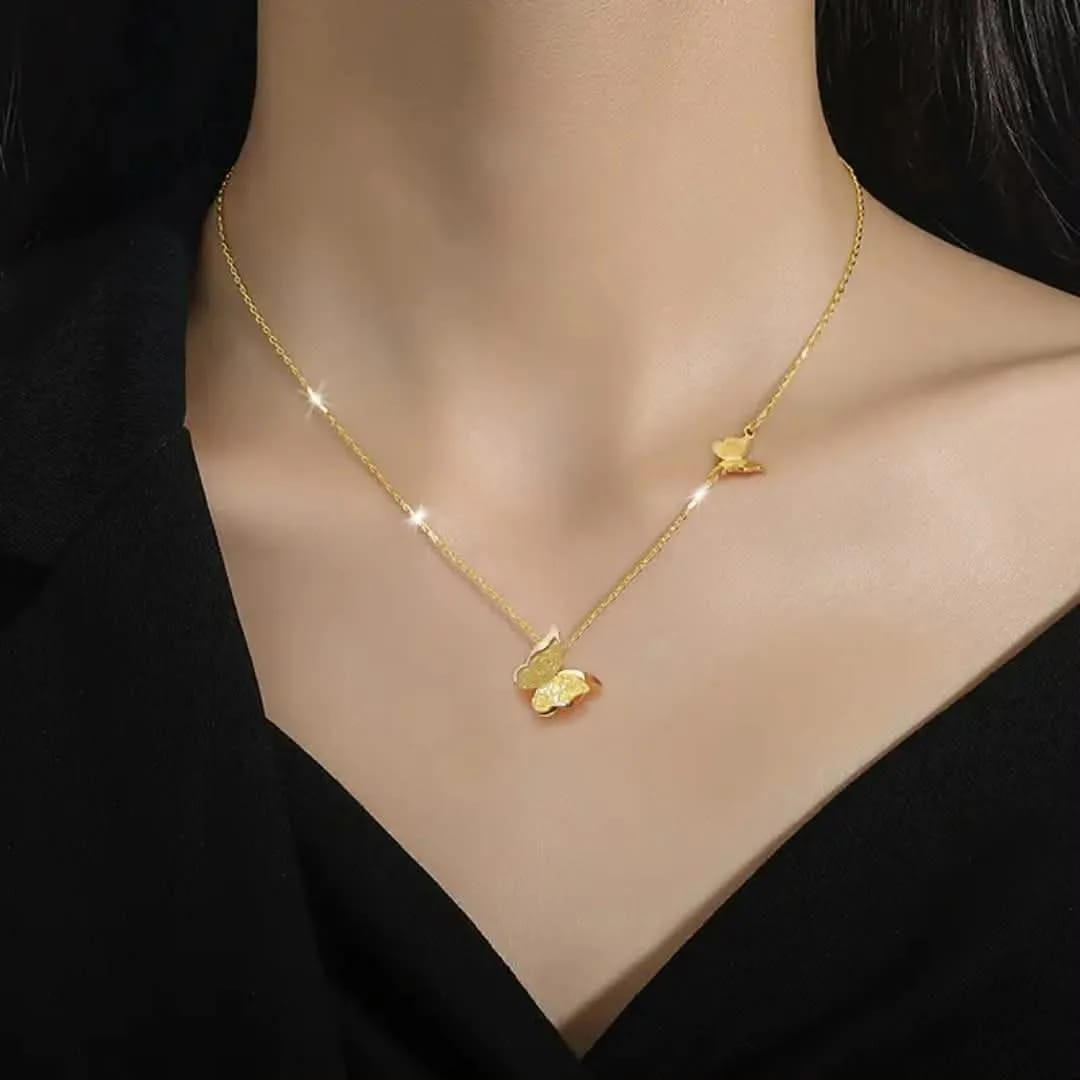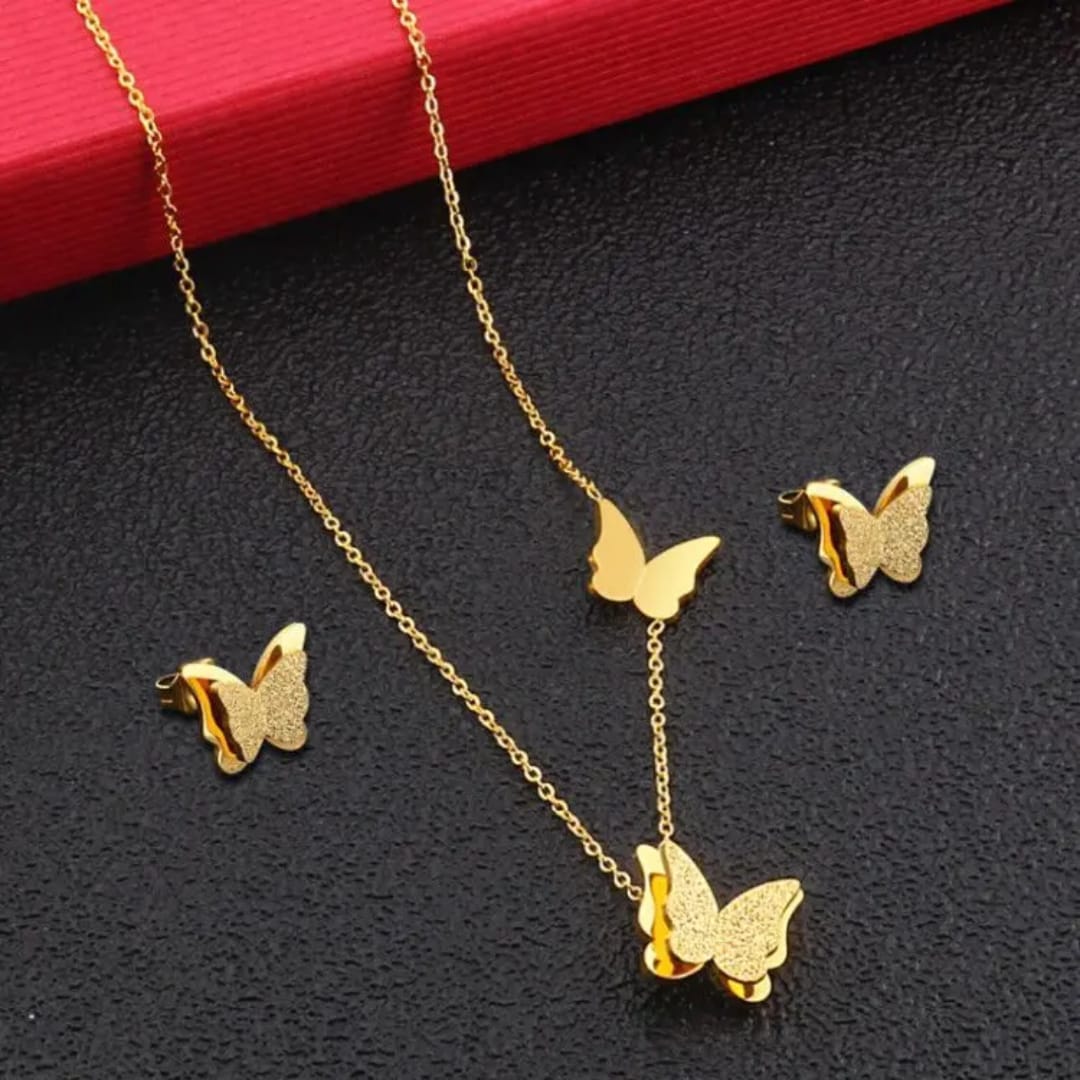 Luxury stainless steel charms pendent double butterfly necklace stud earrings set.
